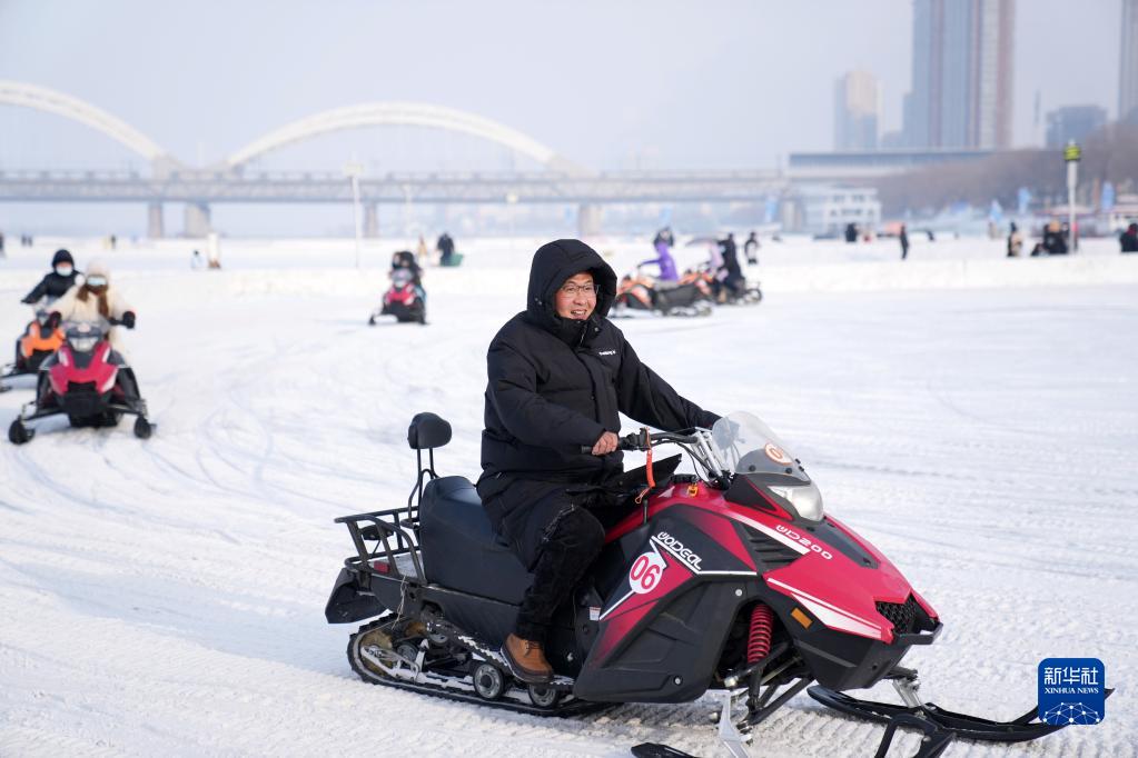 1月22日,游客在哈爾濱松花江冰雪嘉年華園區(qū)內體驗冰雪娛樂項目。