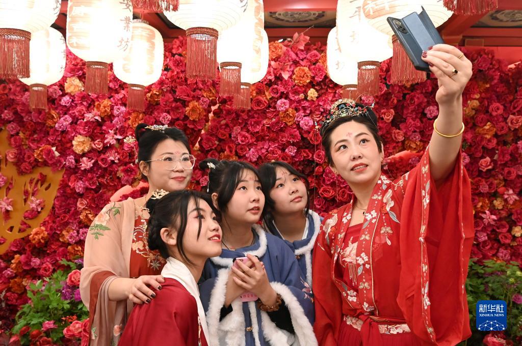 春節(jié)期間,位于西安曲江新區(qū)的“長安十二時辰”沉浸式唐風市井生活街區(qū)迎來旅游高峰。在這個涵蓋唐食薈萃、百藝手作、文化宴席、沉浸演藝等多種業(yè)態(tài)的街區(qū)里,許多游客身著漢服、繪上美妝,游覽、留影,感受大唐風貌,體驗“唐潮”之旅。