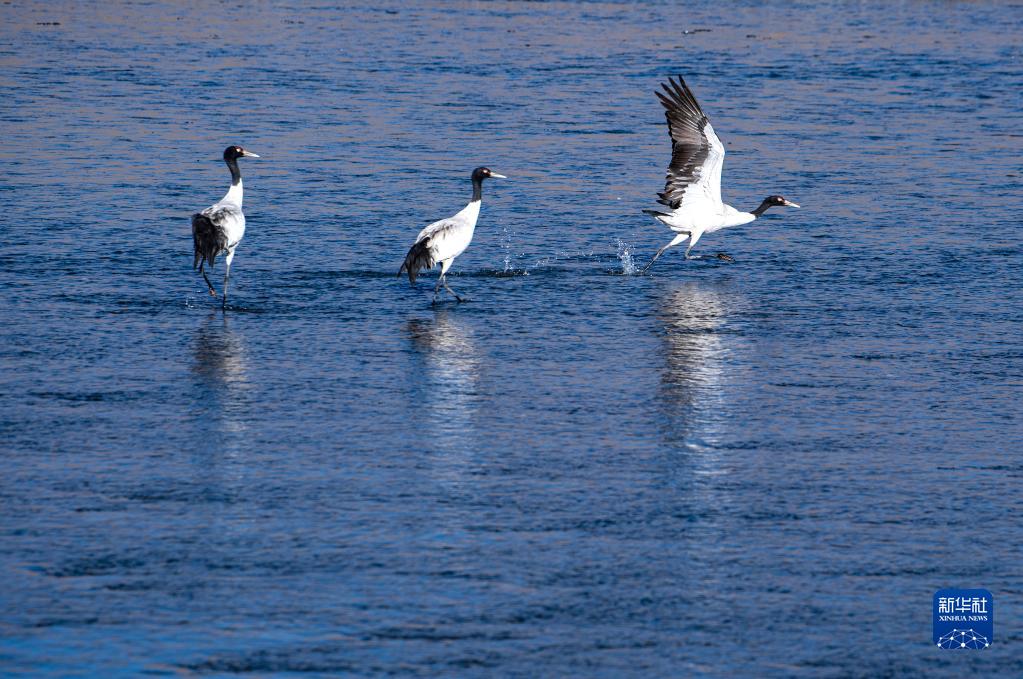 在西藏雅魯藏布江中游河谷黑頸鶴國家級自然保護區日喀則片區拉孜縣附近,大量越冬的黑頸鶴翩翩起舞,迎接春天的到來。