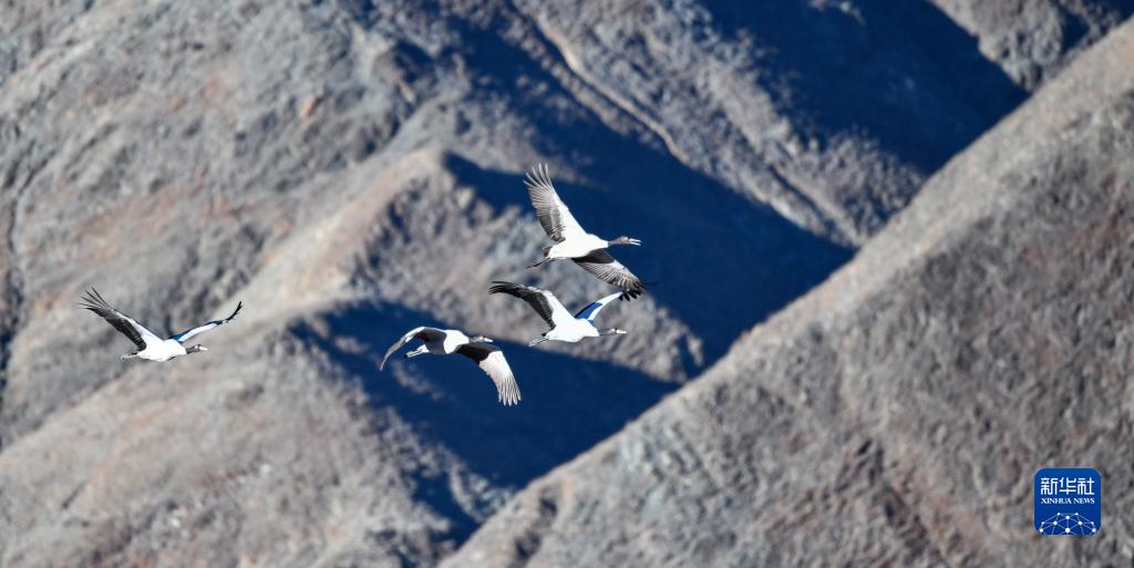 在西藏雅魯藏布江中游河谷黑頸鶴國家級自然保護區日喀則片區拉孜縣附近,大量越冬的黑頸鶴翩翩起舞,迎接春天的到來。