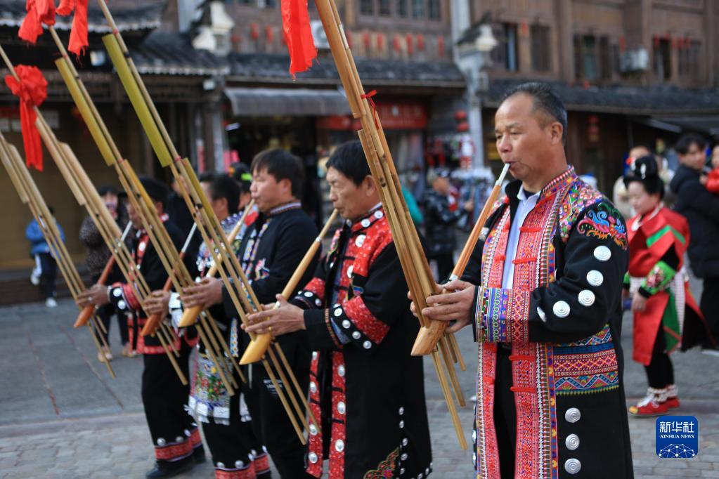 1月25日,群眾在貴州省黔東南苗族侗族自治州凱里市下司古鎮為游客表演。