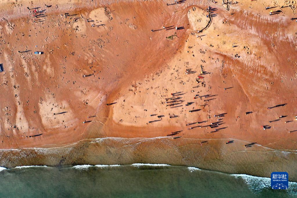 1月25日,游客在廣西防城港市的海灘游玩(無人機照片)。