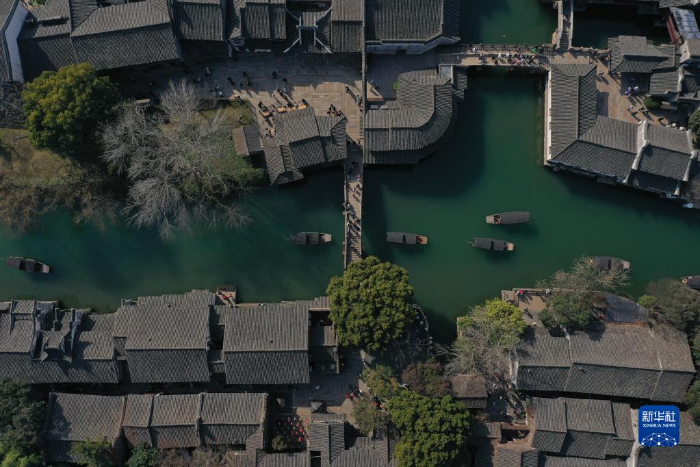 1月26日,游客在浙江省桐鄉市烏鎮景區游覽(無人機照片)。