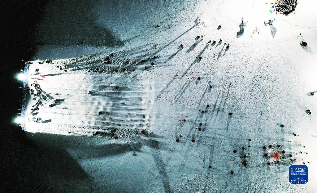 1月25日,游客在山東省臨沂市郯城縣郯國古城景區滑雪場游玩(無人機照片)。