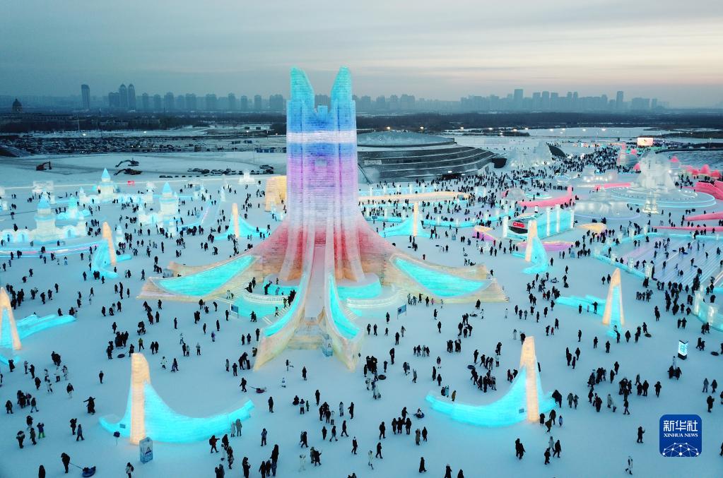 1月25日,游客在哈爾濱冰雪大世界園區(qū)內(nèi)游玩(無(wú)人機(jī)照片)。