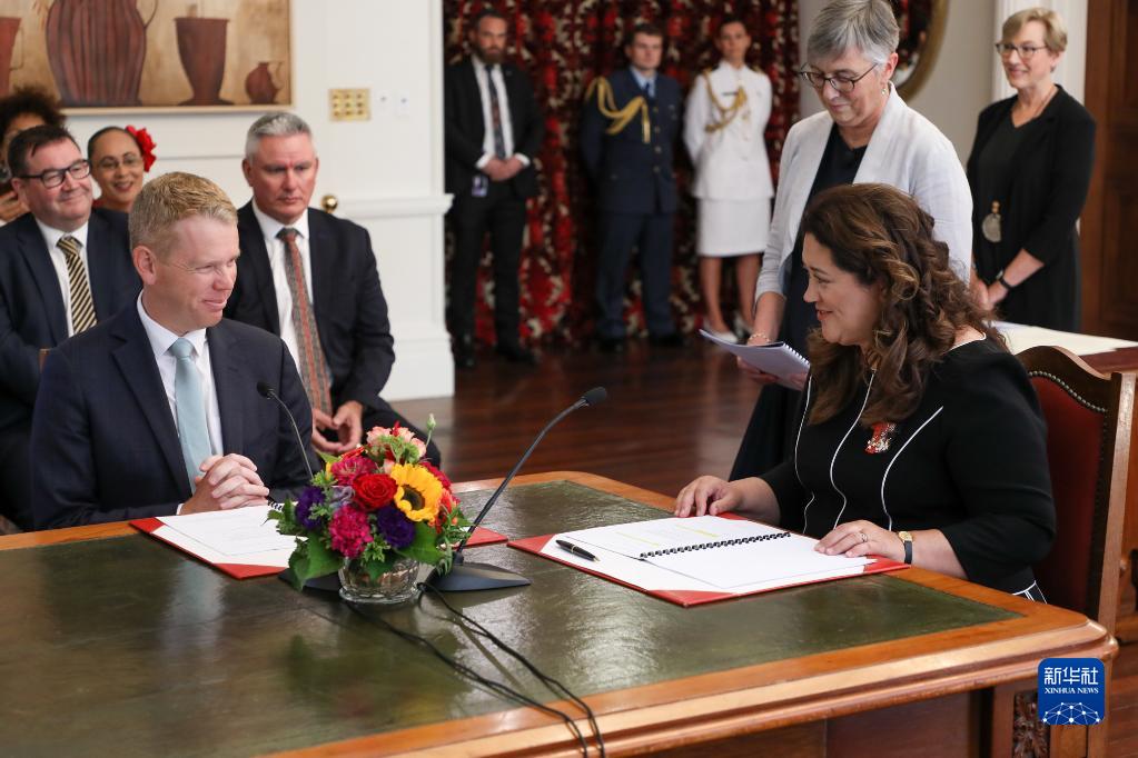 1月25日,在新西蘭首都惠靈頓,新西蘭總督基羅(前右)簽署文件任命新一任新西蘭總理克里斯·希普金斯(前左)。