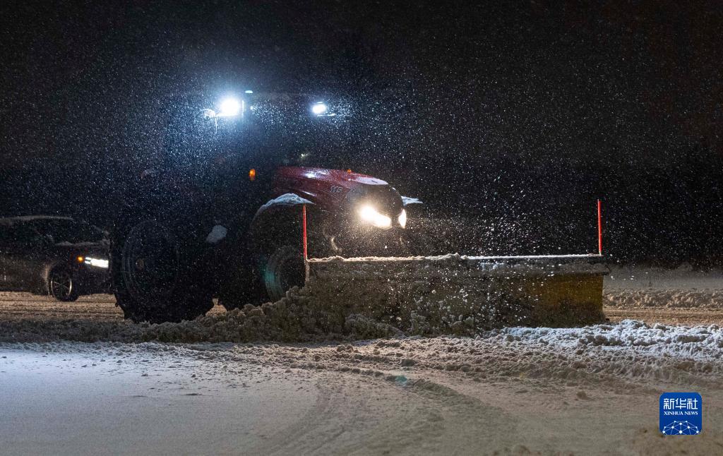1月25日,在加拿大大多倫多地區(qū)米西索加,鏟雪車清理道路積雪。