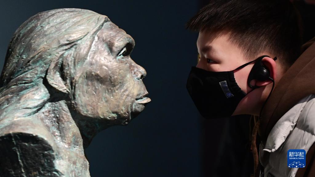 1月25日,在陜西考古博物館,一位小游客凝視藍田人復原像。