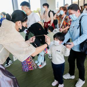 當(dāng)天,中國(guó)廈門航空MF819航班抵達(dá)菲律賓首都馬尼拉國(guó)際機(jī)場(chǎng)。為迎接中國(guó)游客,菲律賓旅游部在現(xiàn)場(chǎng)安排了特色民樂表演,熱烈歡迎中國(guó)游客到來。身穿傳統(tǒng)民族服裝的菲旅游部長(zhǎng)克里斯蒂娜·弗拉斯科為游客戴上串珠項(xiàng)鏈并送上伴手禮。