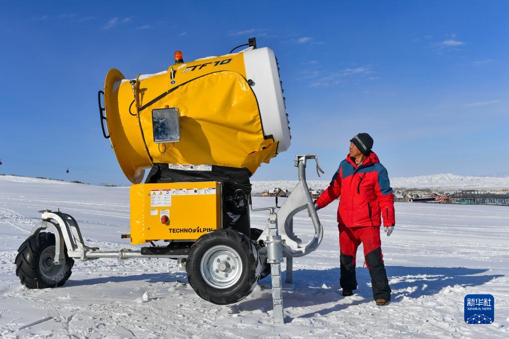 新疆絲綢之路國(guó)際度假區(qū)工作人員黃文勇在雪場(chǎng)工作(1月25日攝)。他和數(shù)十名工友為度假區(qū)的幾十臺(tái)造雪機(jī)提供運(yùn)維保障。