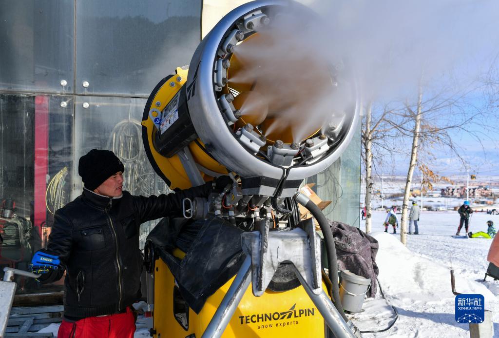 37歲的阿布力哈孜·朱木朱瑪在新疆絲綢之路國際度假區調試造雪設備(1月25日攝)。他來自度假區附近的東梁村,在此工作已有四年,夏天參與文旅演出,冬季在雪場上班。
