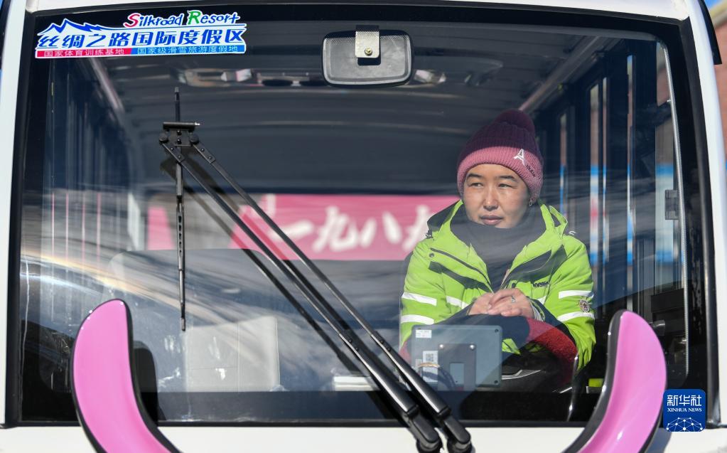 新疆絲綢之路國際度假區3號索道站至6號索道站區間車駕駛員阿曼古麗·阿里甫在站點等候游客上車(1月25日攝)。她來自度假區旁的東灣村,和丈夫一起在此工作。
