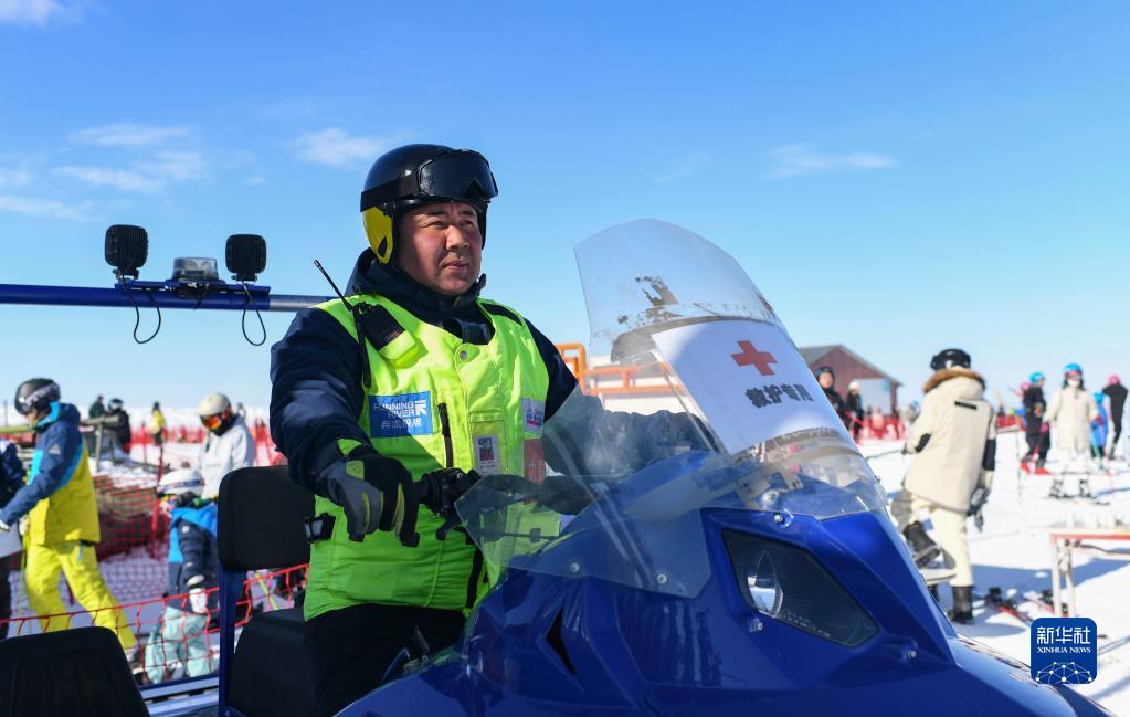 新疆絲綢之路國際度假區雪場救護隊隊員別克扎提汗·白迪力汗在雪道旁值守(1月25日攝)。他來自度假區旁的廟爾溝村。