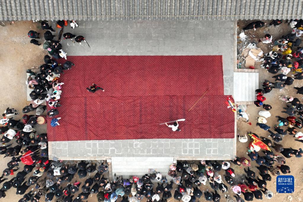 1月26日,梅花拳愛好者在平鄉縣油召鄉八辛莊村進行梅花拳器械對練(無人機照片)。