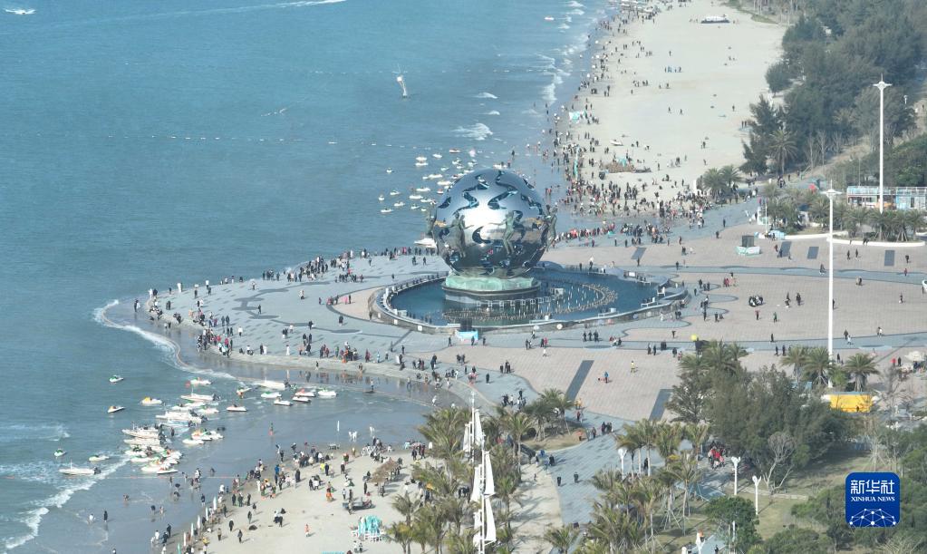 1月26日,游客在廣西北海十里銀灘景區游玩(無人機照片)。