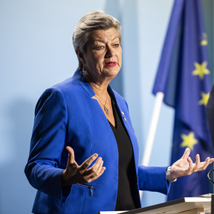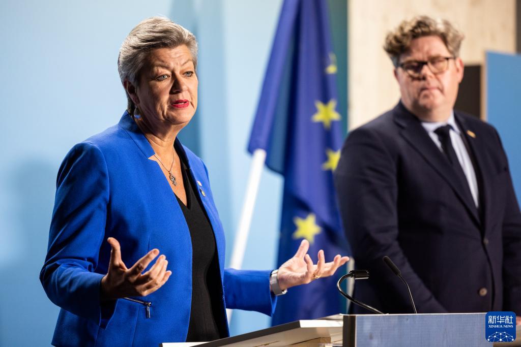 1月26日,在瑞典首都斯德哥爾摩,歐盟委員會負責內部事務的委員于爾娃·約翰松(左)在新聞發布會上發言。