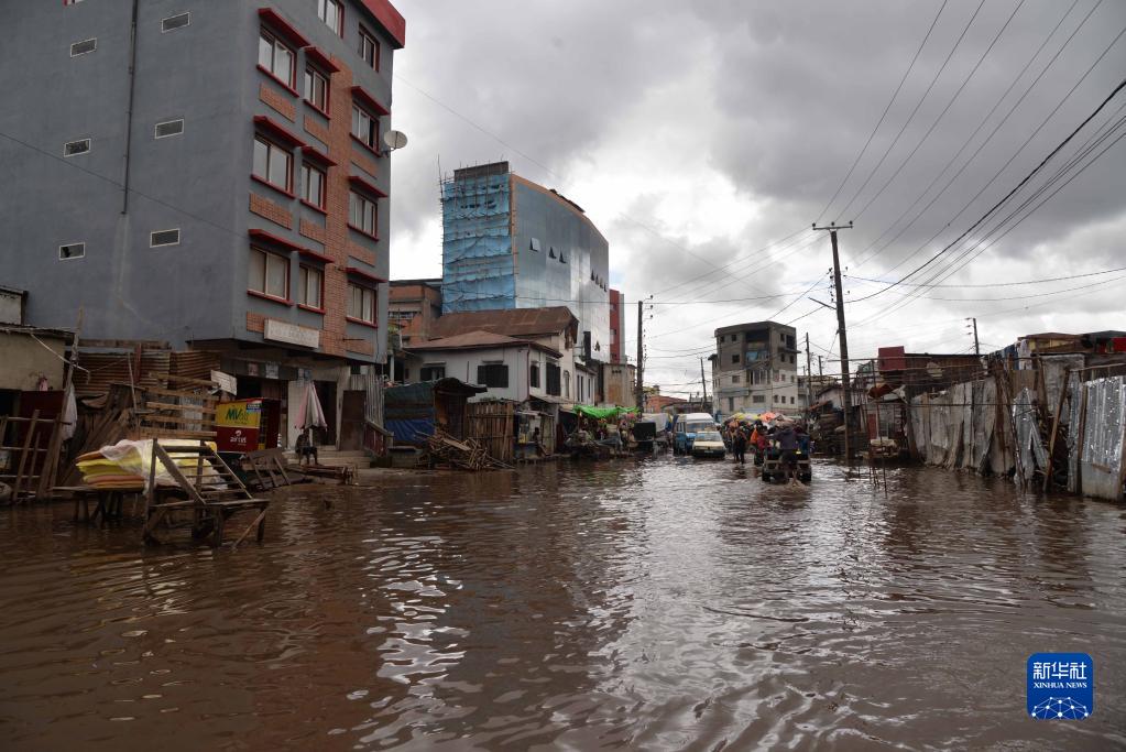 1月25日,在馬達加斯加首都塔那那利佛,暴雨過后道路被積水淹沒。
