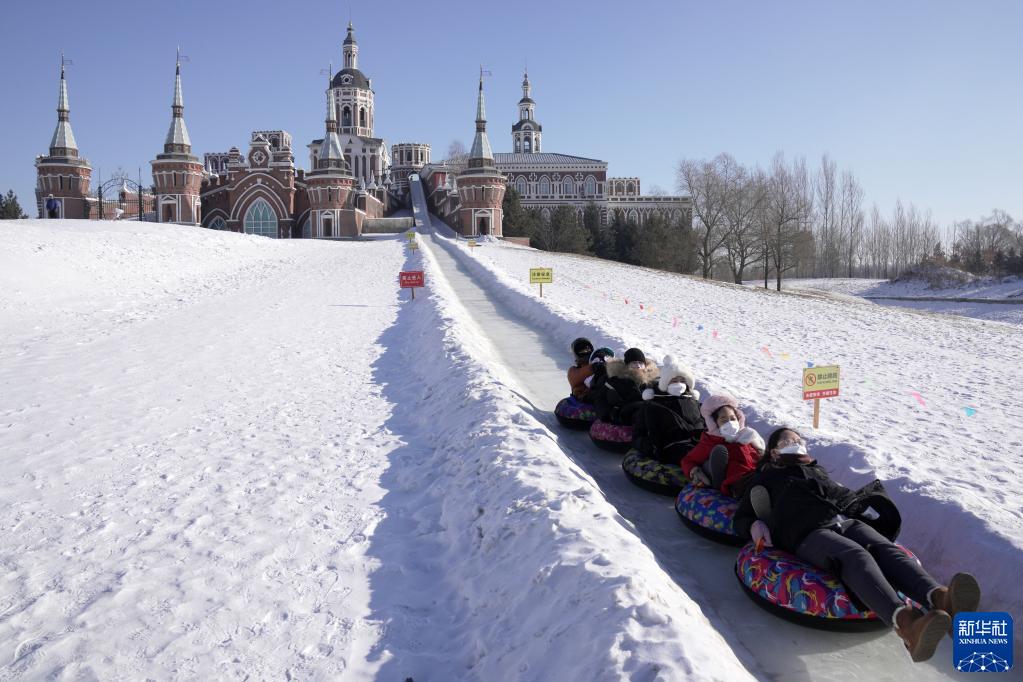 1月26日,游客在哈爾濱伏爾加莊園玩“城堡雪圈”。