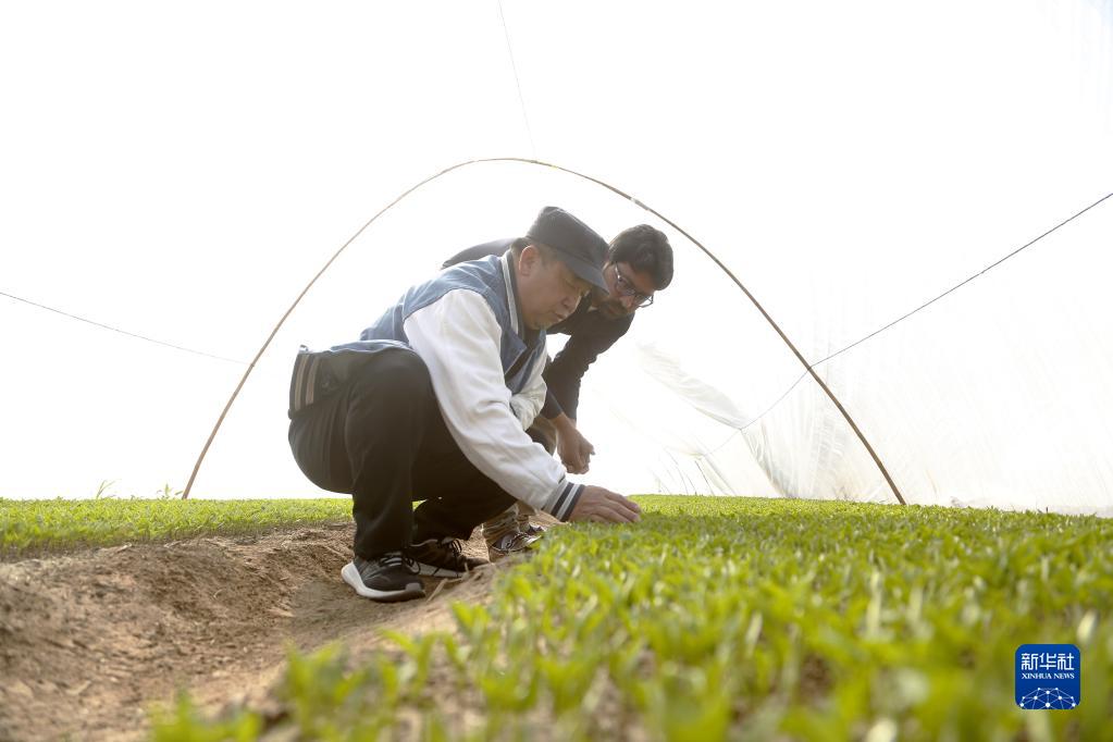 1月16日,在位于巴基斯坦旁遮普省木爾坦的中巴辣椒訂單種植項(xiàng)目辣椒育苗大棚內(nèi),中國(guó)農(nóng)業(yè)專家趙建華(前)帶領(lǐng)巴基斯坦技術(shù)員薩賈德查看辣椒秧苗生長(zhǎng)情況。