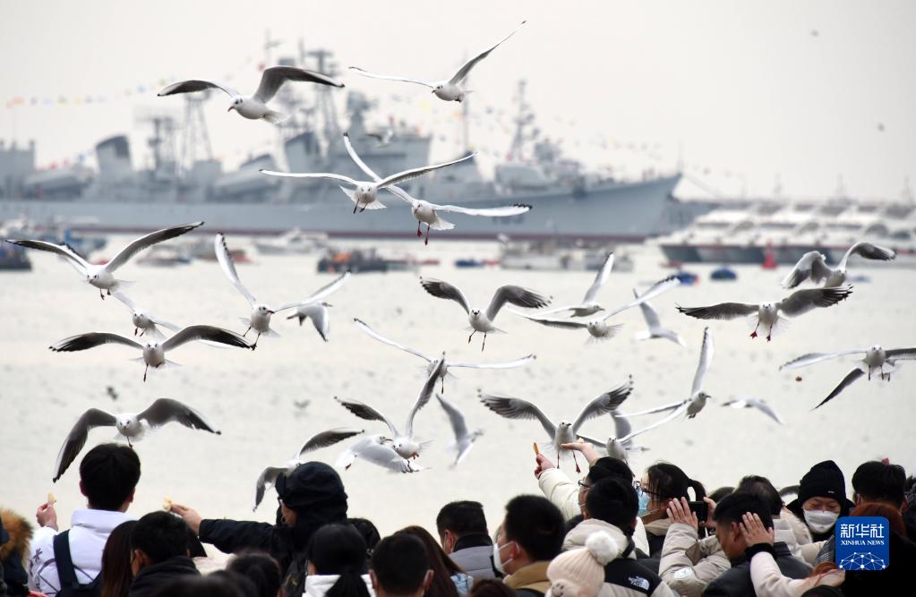 1月26日,游客在青島海軍博物館附近海邊觀賞海鷗。