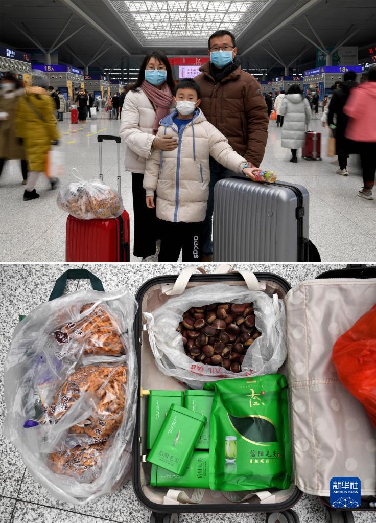 拼版照片:河南省信陽市浉河區董家河鄉高嶺村人劉紅善(右)和愛人傅雪梅、兒子劉宇辰在鄭州東站候車大廳內候車,準備去往廣州(1月26日攝)。劉紅善在廣州已經工作了6年,近3年都沒能回老家過春節,今年專門回家陪老父親過節。下圖為劉紅善行囊里裝的家人給準備的信陽特產茶葉和板栗等(1月26日攝)。