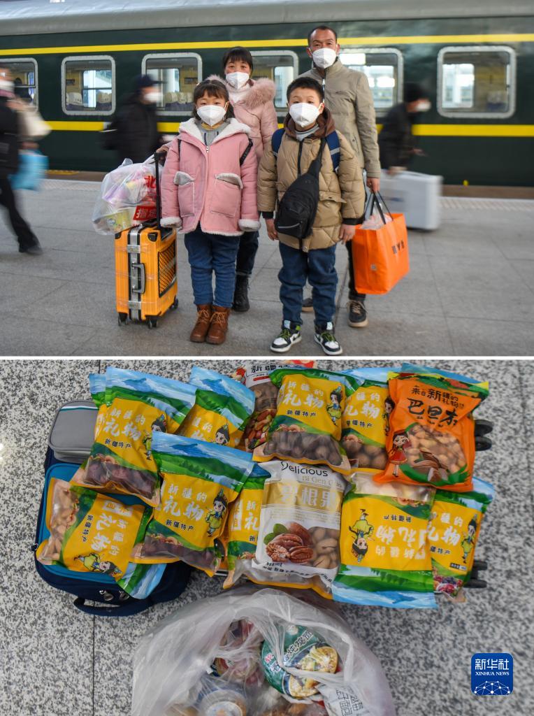 拼版照片:上圖為嫁到甘肅省岷縣的新疆呼圖壁縣人汪元芳(后左一)一家在新疆烏魯木齊站準(zhǔn)備乘坐火車前往甘肅。時(shí)隔兩年,汪元芳帶著全家人回到新疆呼圖壁縣,在娘家度過2023年的春節(jié)(1月26日攝)。下圖為汪元芳一家行囊里裝的物品。除了在火車上的吃食外,汪元芳的父母還給他們裝了葡萄干、核桃、大棗等新疆特色干果(1月26日攝)。
