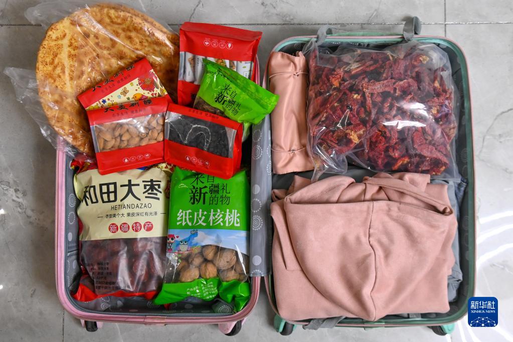 戴詩蕊行囊里裝的物品(1月25日攝)。從上大學開始,每年離開家時,戴詩蕊的父母總會在她行李中放滿馕、和田大棗、紙皮核桃、辣皮子等新疆特色食品。