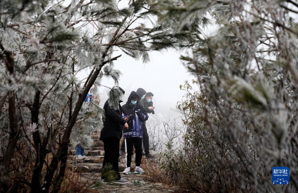 當日,湖南省資興市回龍山景區現霧凇現象,山中樹木銀裝素裹,吸引游人紛至沓來。