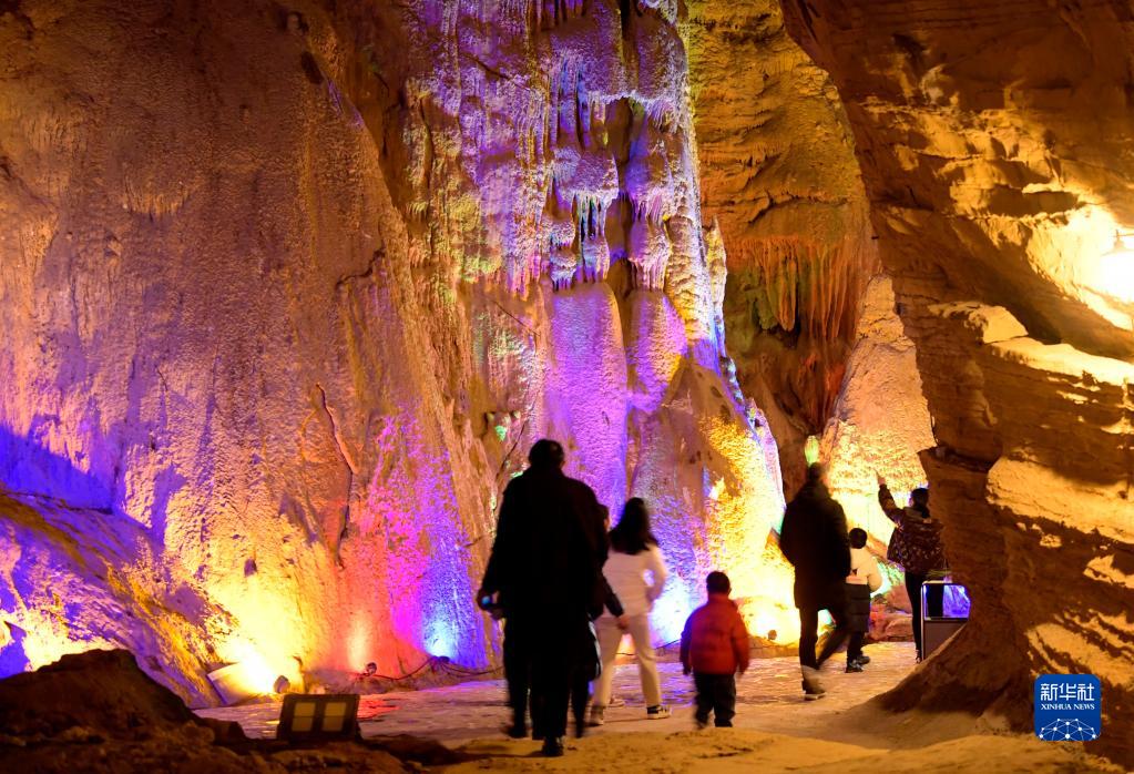 1月27日,游客在湖北省宣恩縣鑼圈巖地質公園體驗洞穴探險。