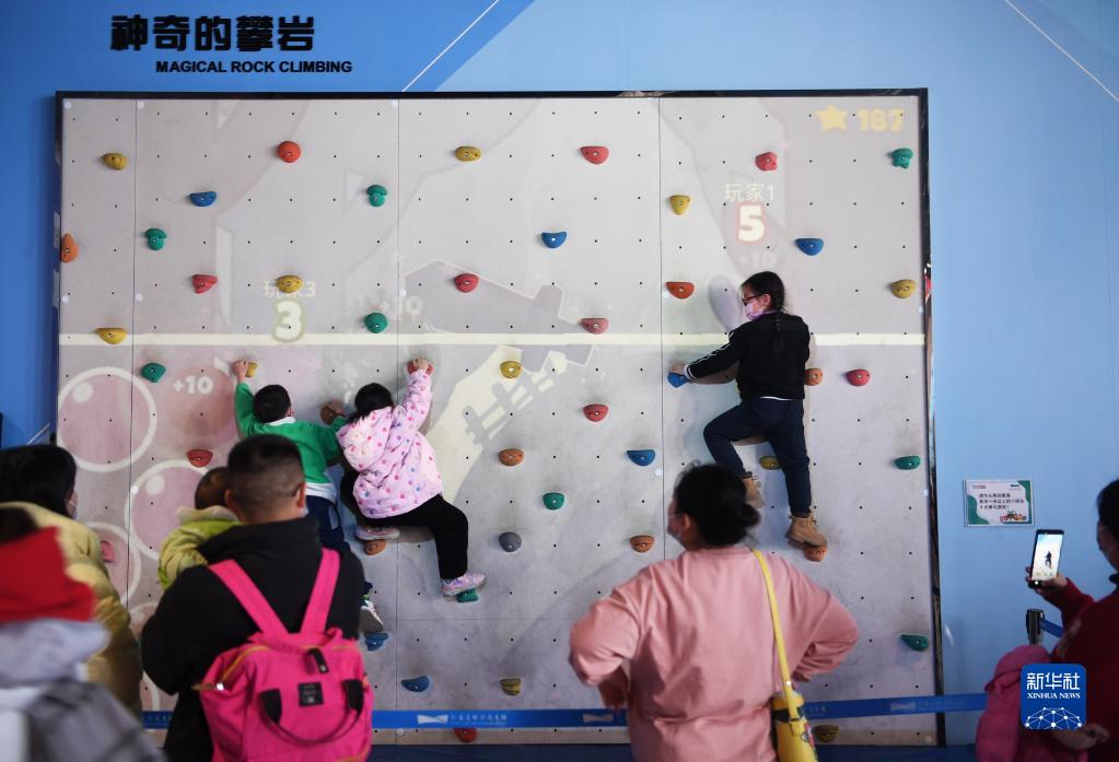 1月27日,小朋友在河南省科技館新館“創享空間”展廳體驗攀巖項目。