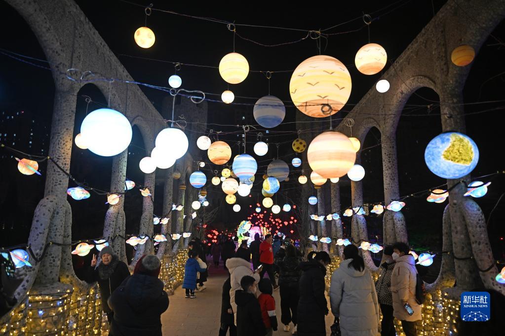 春節期間,天津中華石園景區舉辦的新春民俗燈會吸引了眾多游客。夜幕降臨后,融合兔子、二十四節氣等元素的各式彩燈結合現代光影變得惟妙惟肖、活靈活現。市民及游客在此賞燈游玩、“打卡”拍照,感受節日氛圍。