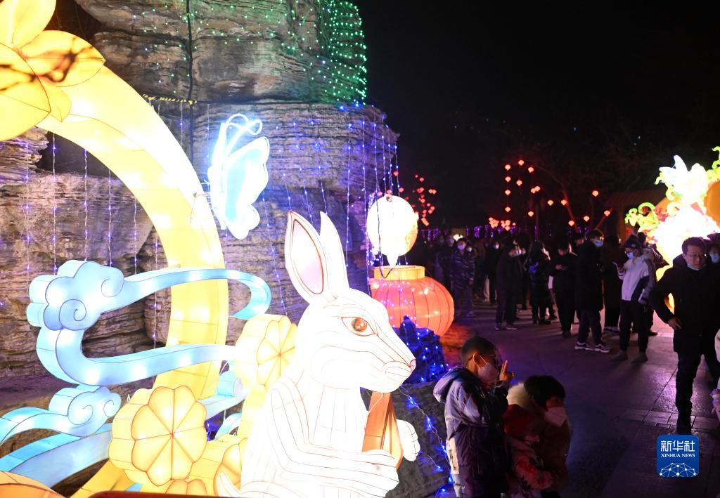 春節期間,天津中華石園景區舉辦的新春民俗燈會吸引了眾多游客。夜幕降臨后,融合兔子、二十四節氣等元素的各式彩燈結合現代光影變得惟妙惟肖、活靈活現。市民及游客在此賞燈游玩、“打卡”拍照,感受節日氛圍。