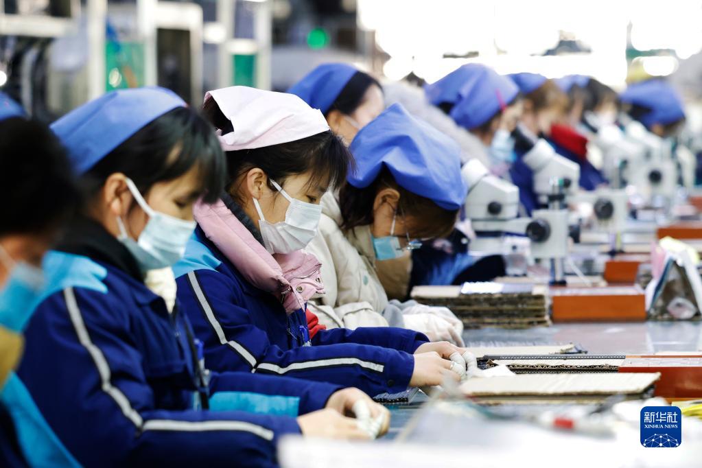 1月27日,在江蘇泗洪經濟開發區,一家電子元器件企業的工人在車間忙碌。