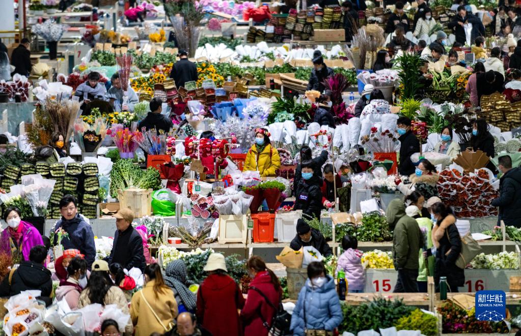 當日是大年初六,位于云南省昆明市的斗南花市內人頭攢動,人們逛花市、買鮮花,歡度假期。