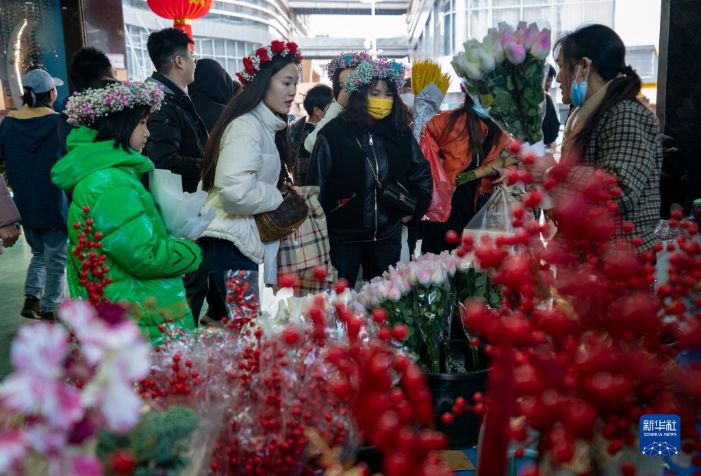 當日是大年初六,位于云南省昆明市的斗南花市內人頭攢動,人們逛花市、買鮮花,歡度假期。