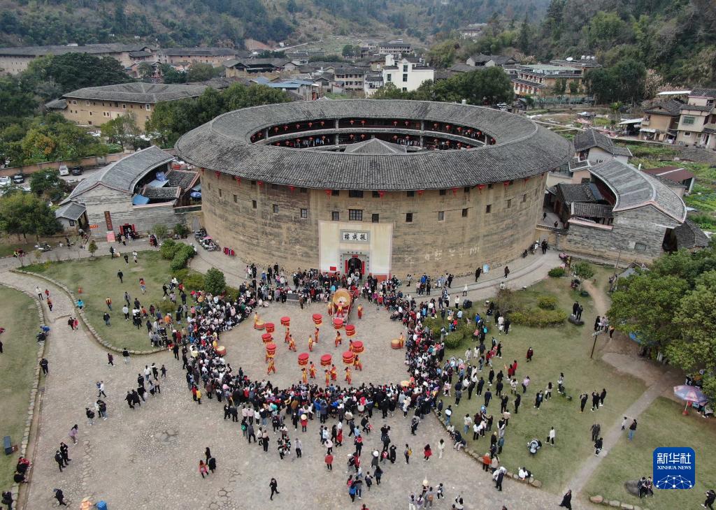 1月25日,游客在福建省龍巖市永定區土樓景區觀看民俗表演(無人機照片) 。