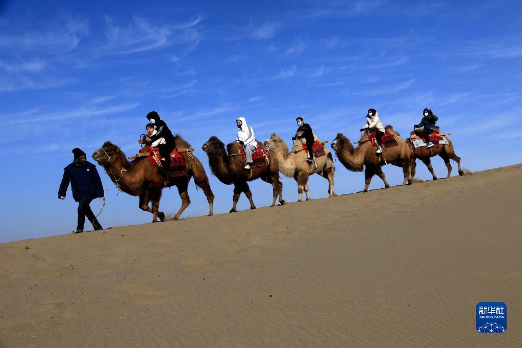 1月27日,游客在甘肅省敦煌市鳴沙山月牙泉景區騎駱駝游覽。