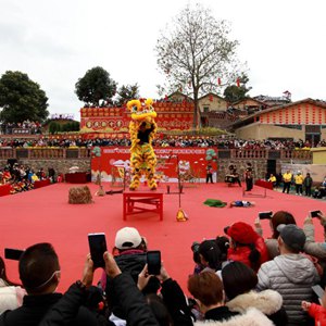 1月27日,人們在肇慶市石牌里文創街區廣場觀看醒獅爭霸賽。