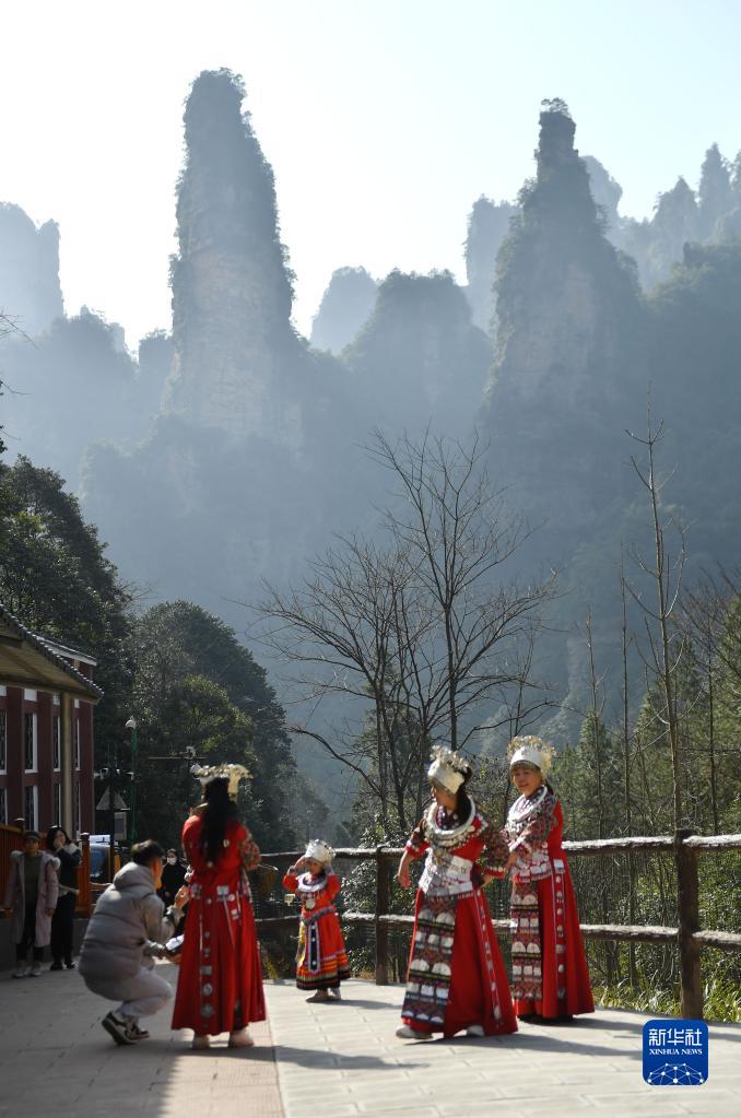 1月27日,幾位游客在張家界國家森林公園游覽,身著苗族服飾拍照留念。
