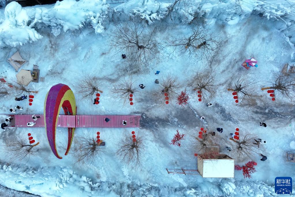1月27日,游客在天河山景區冰雪游樂區內游覽(無人機照片)。