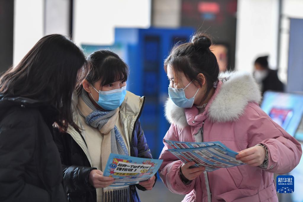 1月28日,在長沙市人力資源市場,用人單位工作人員(右)向求職者介紹崗位信息。