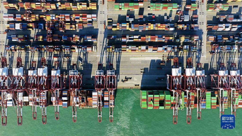 1月27日,集裝箱貨輪在青島港前灣集裝箱碼頭裝卸貨物(無人機照片)。