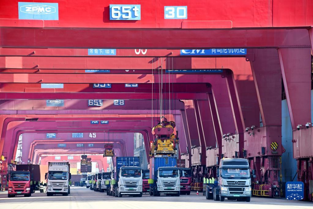 1月27日,在青島港前灣集裝箱碼頭,貨車排隊運送集裝箱。