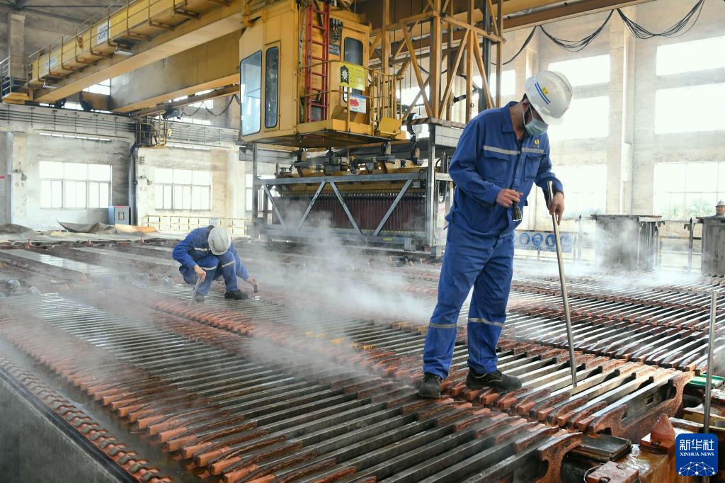 1月28日,工人在安徽銅陵有色金屬(集團)公司金隆銅業有限公司電解車間生產電解銅。