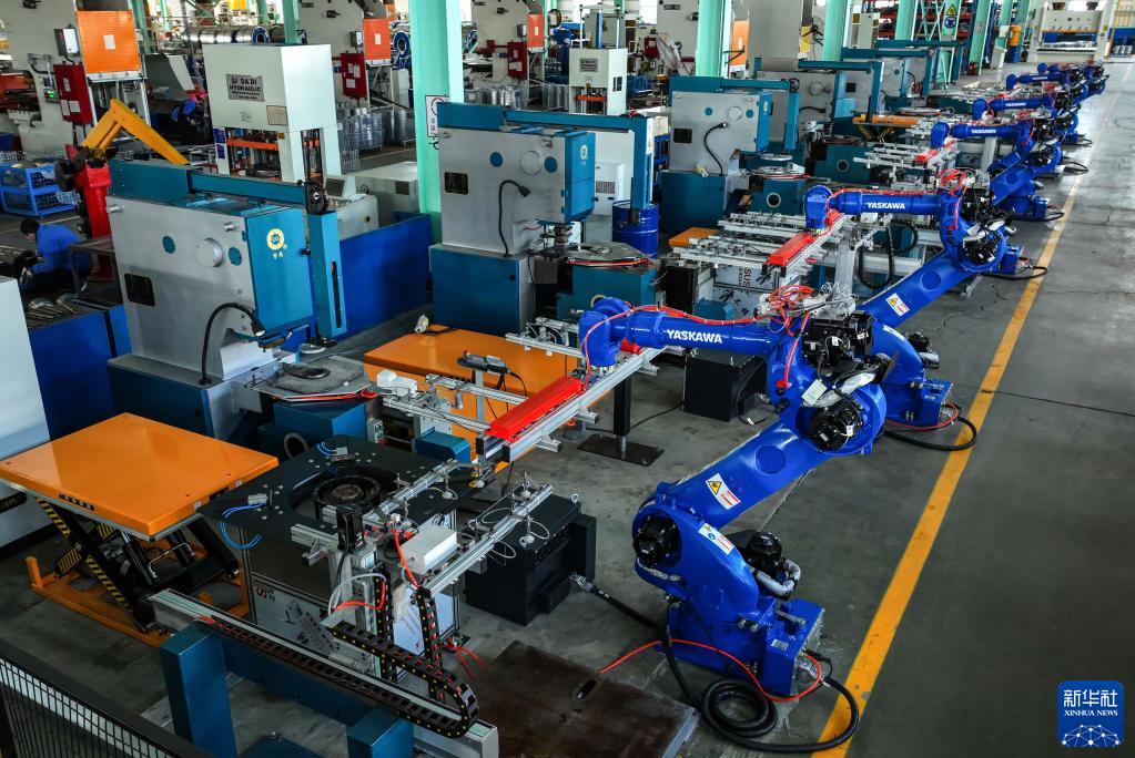 1月28日,智能機器人在山東省榮成市經濟開發區一家電機制造企業的智能化生產車間內作業(無人機照片)。