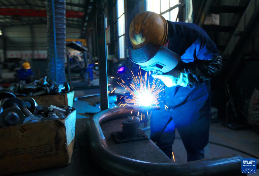 1月28日,工人在山東省臨沂市平邑縣地方鎮一家健身器材生產企業車間內焊接鋼材。