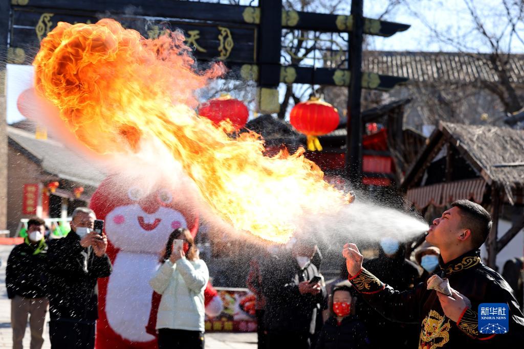 1月24日,民間藝人在山東省棗莊市鐵道游擊隊(duì)景區(qū)表演“噴火”絕活。