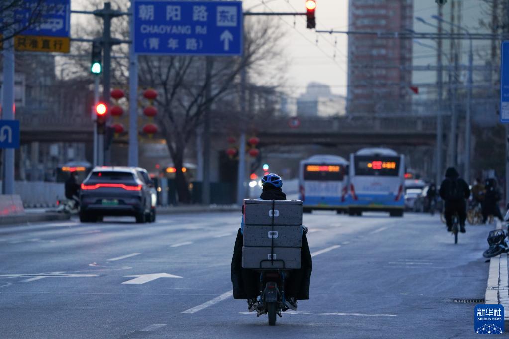 1月28日,盒馬鮮生北京十里堡店配送員侯殿彬騎車行駛在朝陽路上,配送第一單商品。