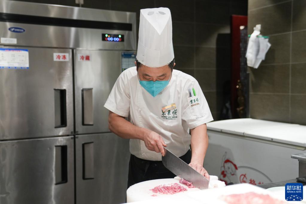 1月28日,在北京東來順飯莊總店,廚師馮炳山在切節后開工第一天的第一盤鮮羊肉。