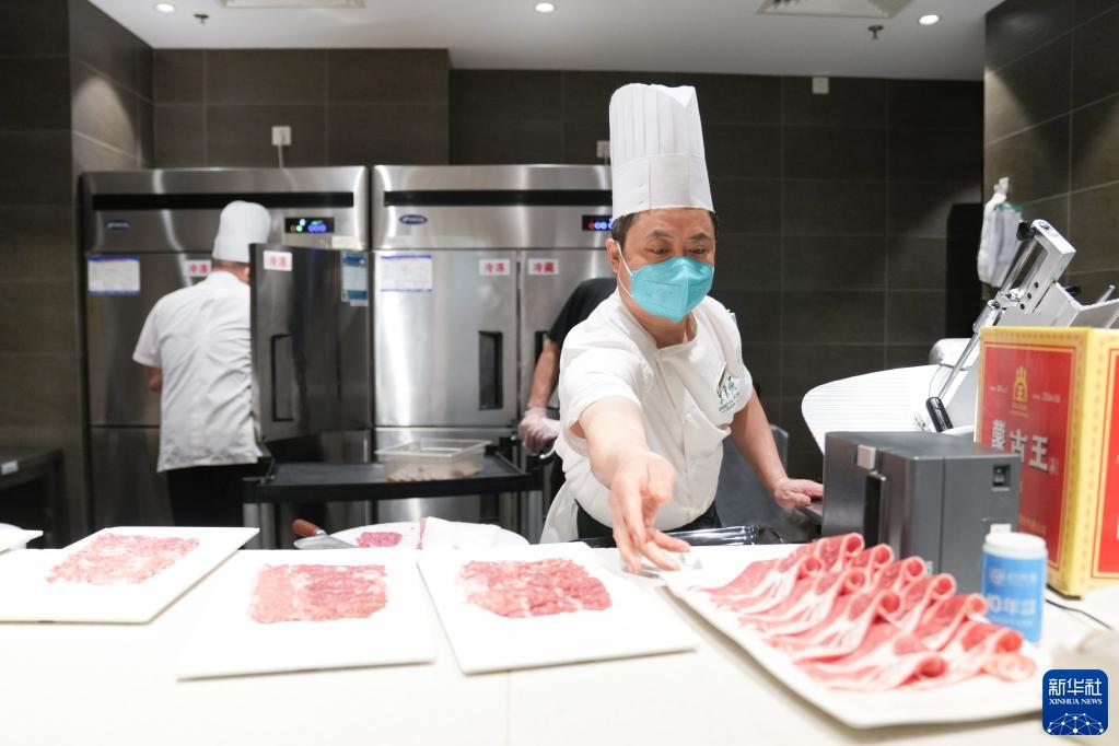 1月28日,在北京東來順飯莊總店,廚師馮炳山(前)將第一桌客人下單的肉切好等候服務員上菜。